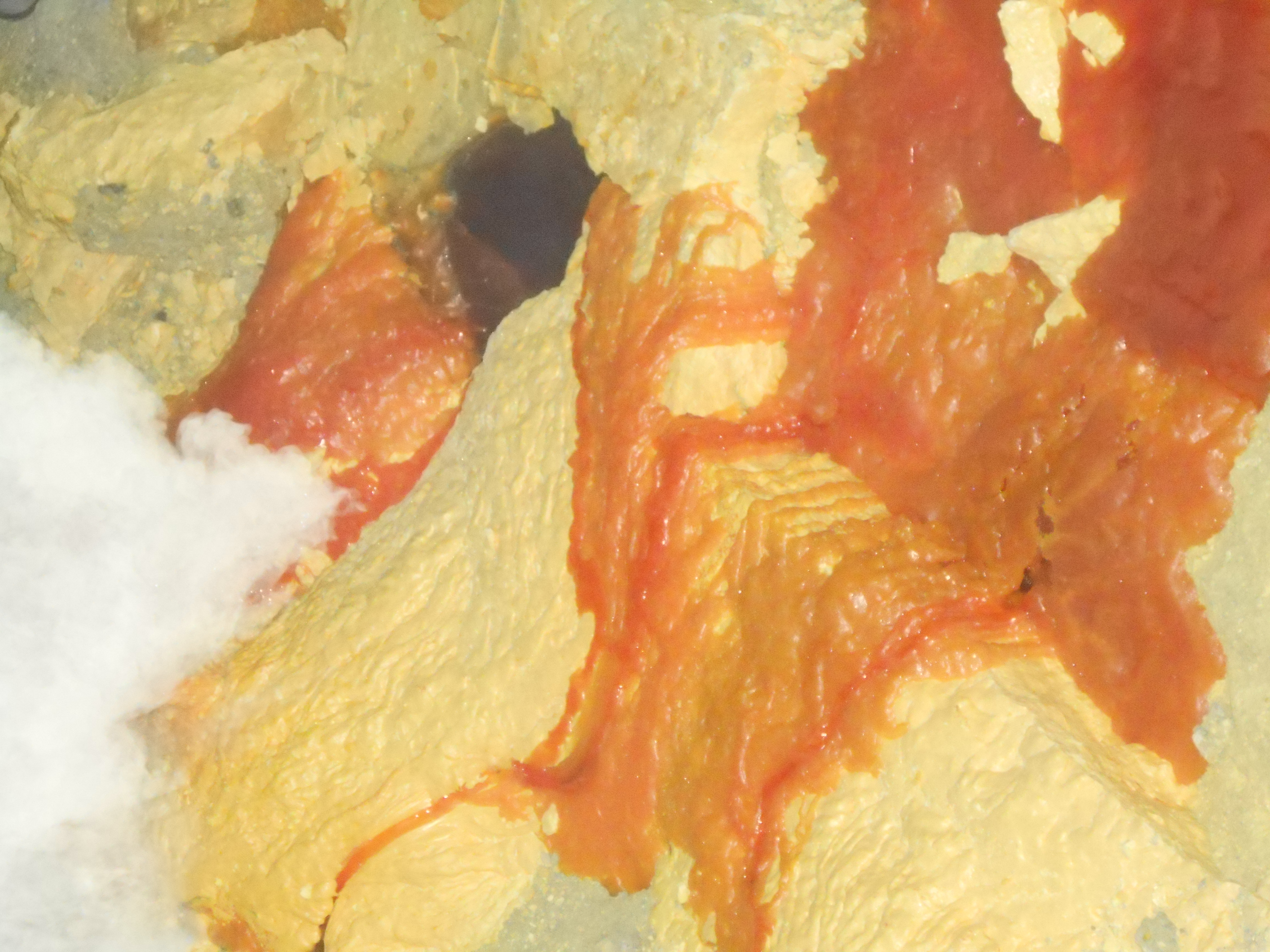 Flüssiges Schwefel und Schwefeldampf kommt aus der Erde. |